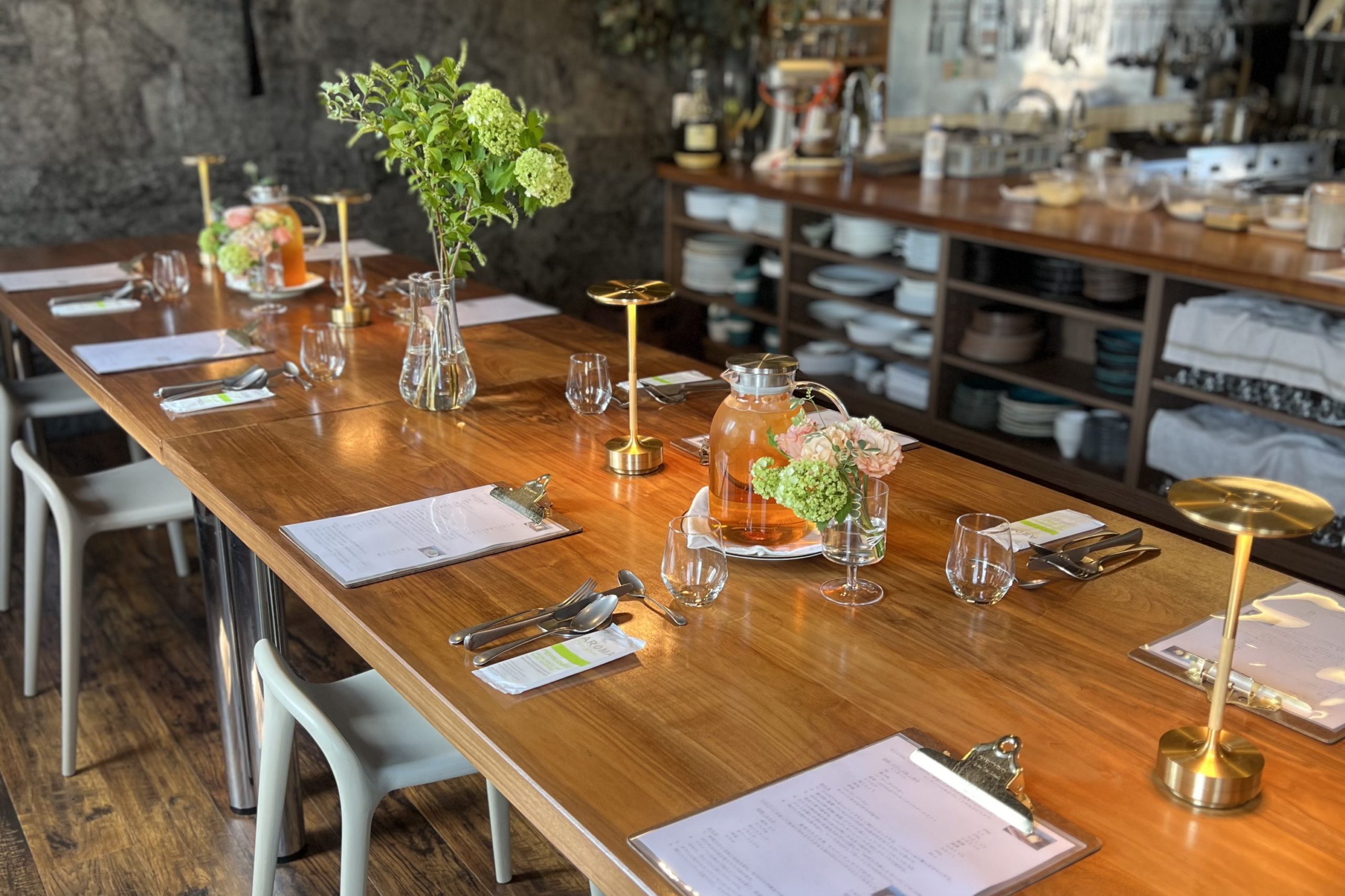 ウォルナット材を基調とした上質な空間で、料理とワインのペアリングも楽しめる特別なレッスン。